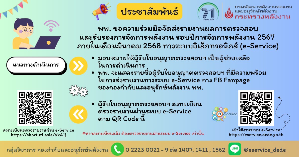 ในรอบปีการจัดการพลังงาน 2567 พพ. ขอแจ้งให้อาคารควบคุมและโรงงานควบคุมทุกแห่ง ส่งรายงานผลการตรวจสอบและรับรองการจัดการพลังงานภายในเดือนมีนาคม 2568 ทางระบบอิเล็กทรอนิกส์ (e-Service) เป็นช่องทางหลักเท่านั้น โดยสามารถมอบหมายให้ผู้รับใบอนุญาตตรวจสอบและรับรองการจัดการพลังงานเป็นผู้ให้ความช่วยเหลือท่านในการดำเนินการ